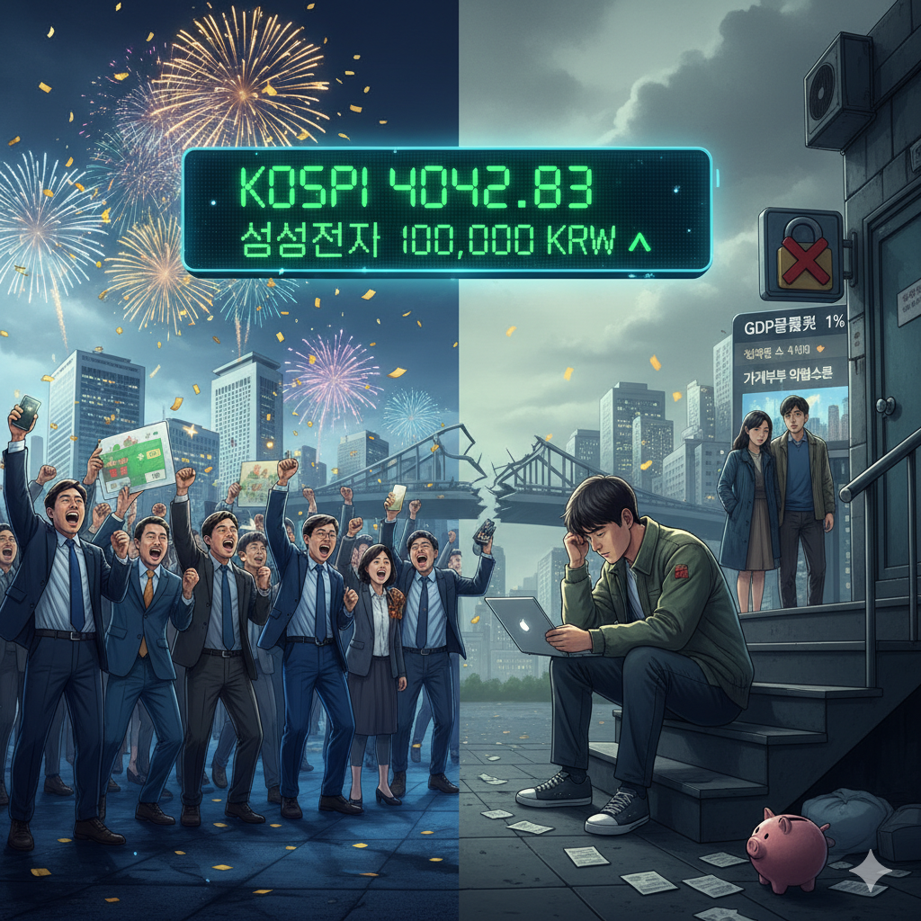 사실 이번 코스피 4000 랠리는 삼성전자나 SK하이닉스 같은 '극소수'의 초대형 반도체 기업들이 거의 다 이끌었다고 해도 과언이 아닙니다. 하지만 가장 큰 문제는 바로 '단절' AI와 반도체 수출로 이 대기업들은 엄청난 돈을 벌고 있지만, 그 따뜻한 기운이 우리 동네 사장님들(소상공인), 일자리를 찾는 청년들, 그리고 이미 빚이 많은 가계처럼... 우리가 발 딛고 사는 '진짜 현실 경제'로는 거의 전해지지 않고 있다는 거죠.