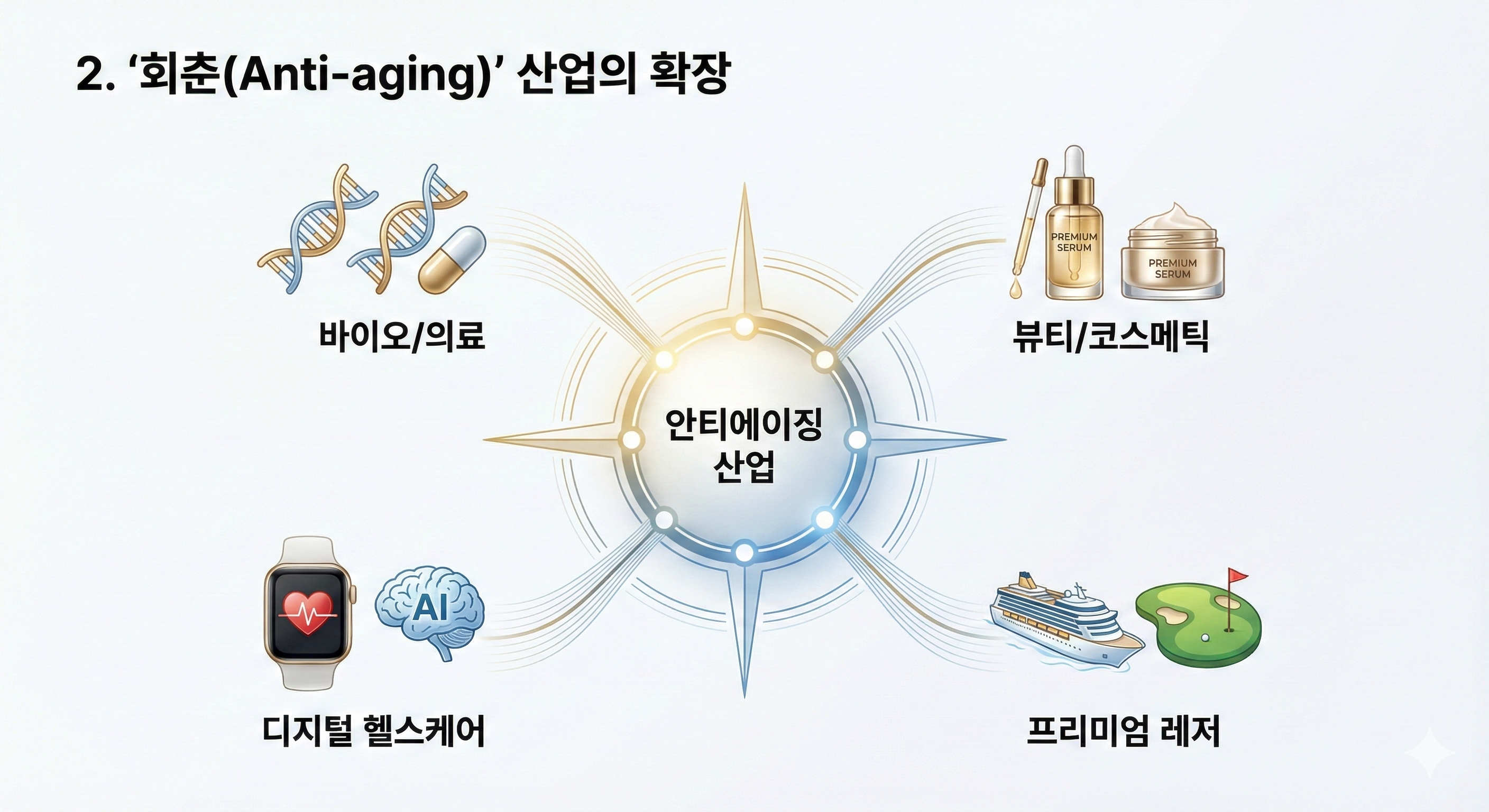 [안티에이징 산업이 단순한 화장품을 넘어 다양한 분야로 확장되고 있음을 보여주는 인포그래픽으로 바이오/의료, 뷰티/코스메틱, 디지털 헬스케어, 프리미엄 레저 등 욜드 세대를 겨냥한 4대 핵심 분야를 나침반 형태로 구성하여 산업의 넓은 스펙트럼을 표현한 그림]