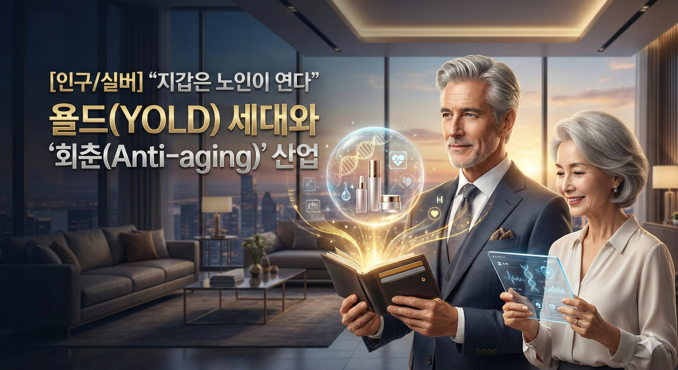 [욜드(YOLD) 세대의 활기차고 경제적으로 여유로운 모습을 상징하는 이미지로 고급스러운 라운지를 배경으로, 스마트한 노신사가 지갑을 열어 최첨단 안티에이징 솔루션(바이오, 디지털 헬스 등)에 투자하는 모습을 통해 새로운 실버 산업의 도래를 표현한 AI 이미지]
