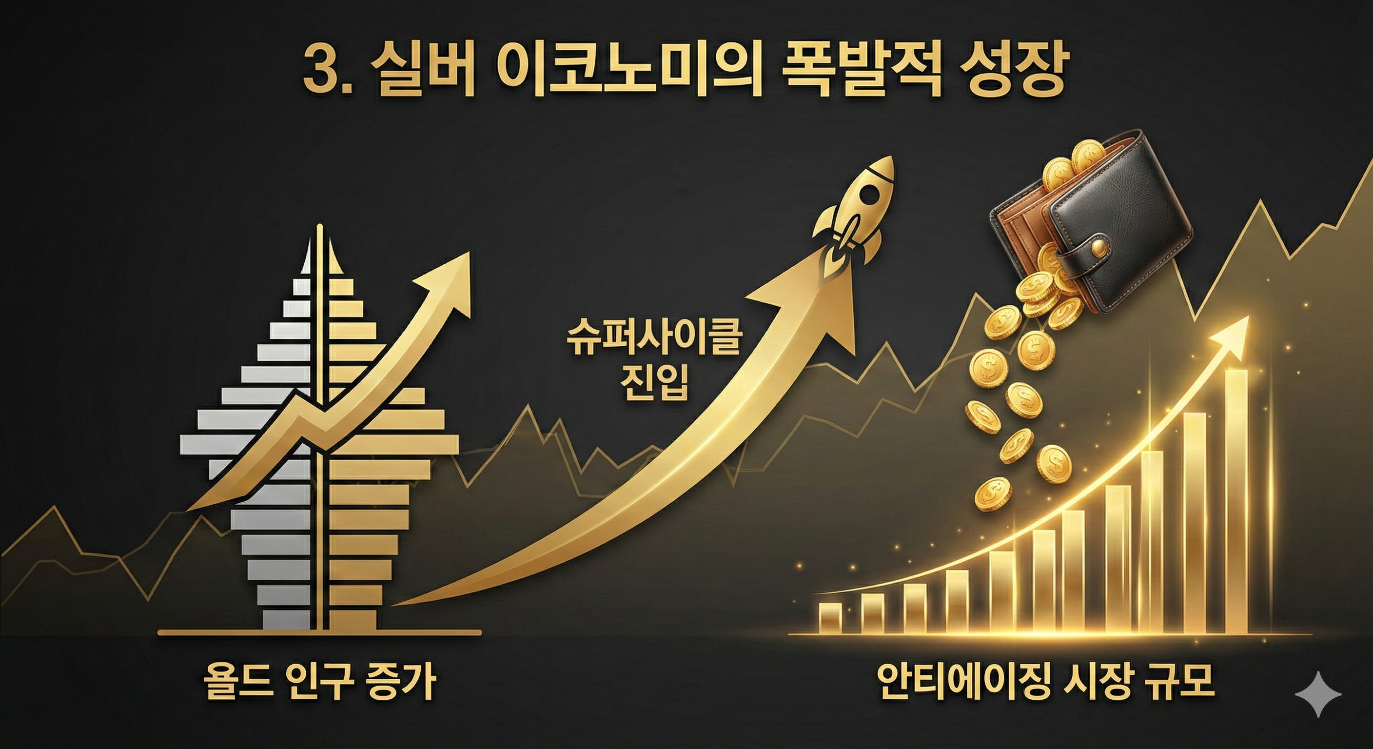 [욜드 인구의 증가와 이들의 높은 소비력이 결합되어 안티에이징 시장이 폭발적으로 성장(슈퍼사이클 진입)하는 모습을 직관적인 성장 차트와 자금 흐름 아이콘으로 표현하고 실버 이코노미의 거대한 잠재력을 시각적으로 강조한 사진]